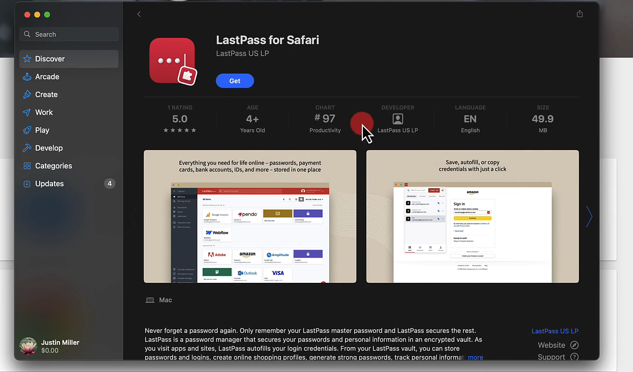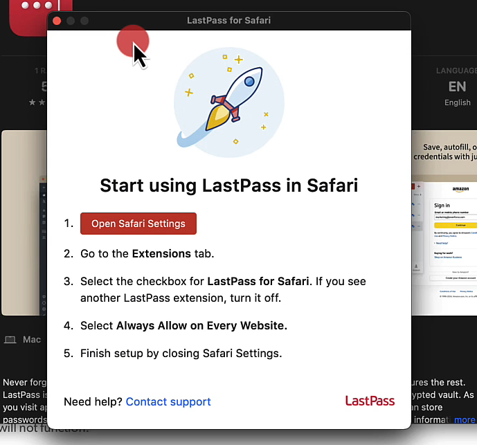 Next, log into your Lastpass account and you'll see the Lastpass extension appear in your Safari browser.